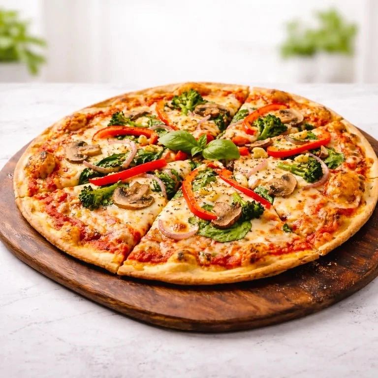 mit frische Champignons, rote Paprika, Zwiebeln. Spinat, Brokkoli, Knoblauch und Käse auf fruchtiger Tomatensoße.