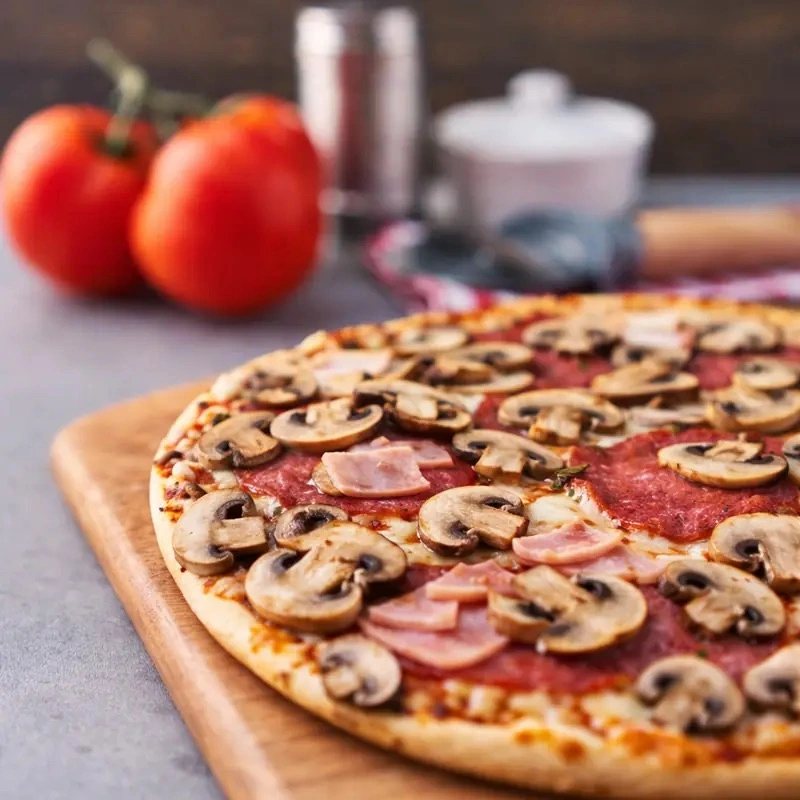 mit würziger Salami, saftigem Schinken und frischen Champignons